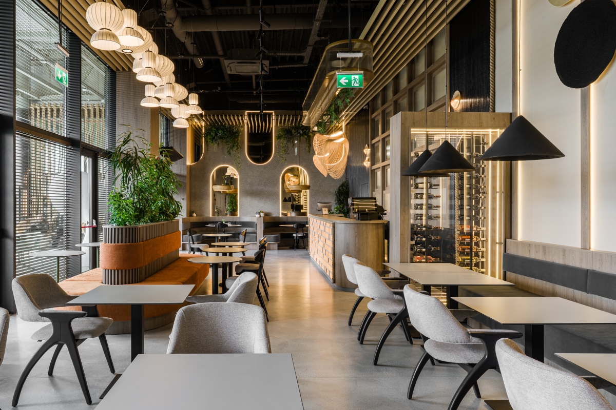 O altă opțiune inovativă ar fi pardoselile realizate cu microciment dedicate spațiilor comerciale și HoReCa. Acesta este un material ideal pentru crearea unui aspect continuu, modern, cu rezistență sporită la trafic și întreținere ușoară.
