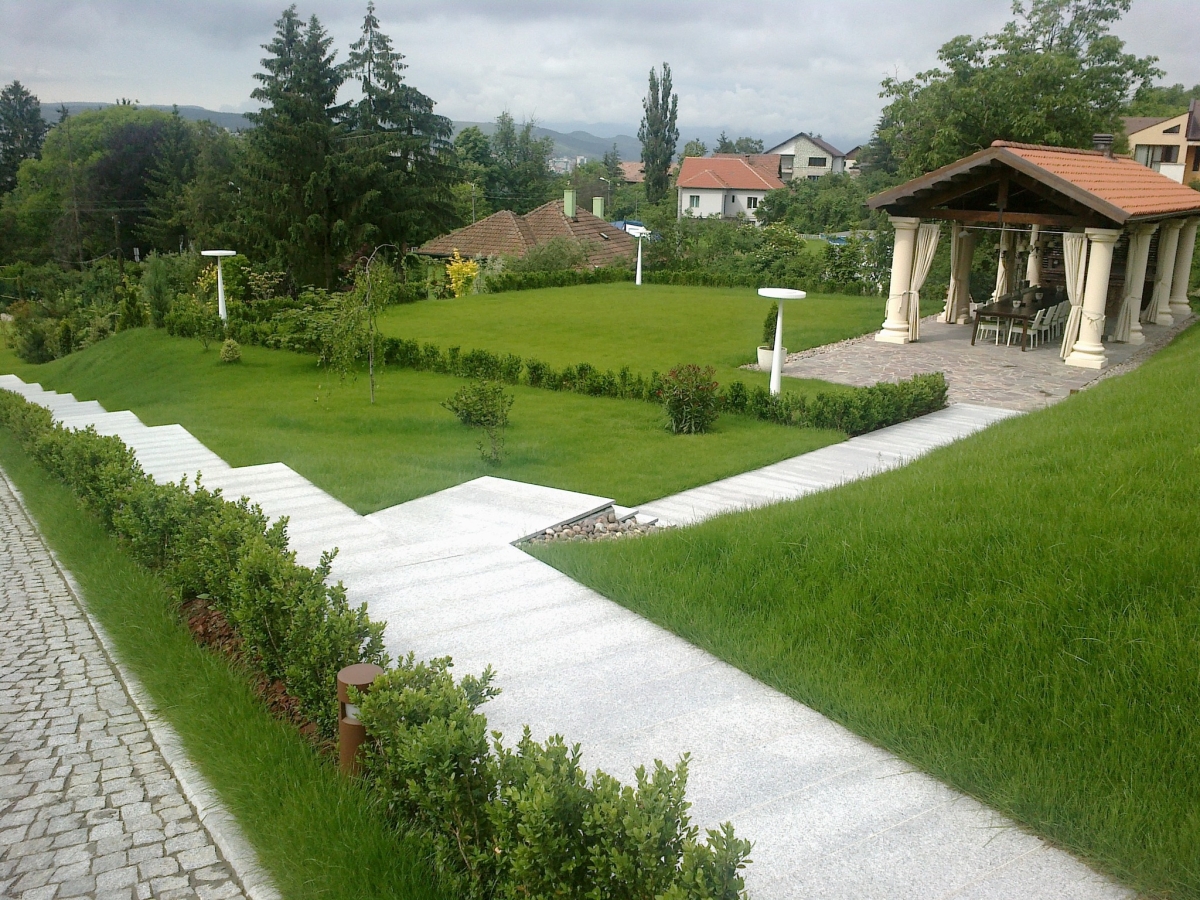 Elemente naturale incluse: gazon, pavaje rustice sau din piatră naturală, grădini alpine, grădini japoneze, aranjamente grădini, lacuri, cascade, fântâni arteziene, garduri vii, ronduri de flori;