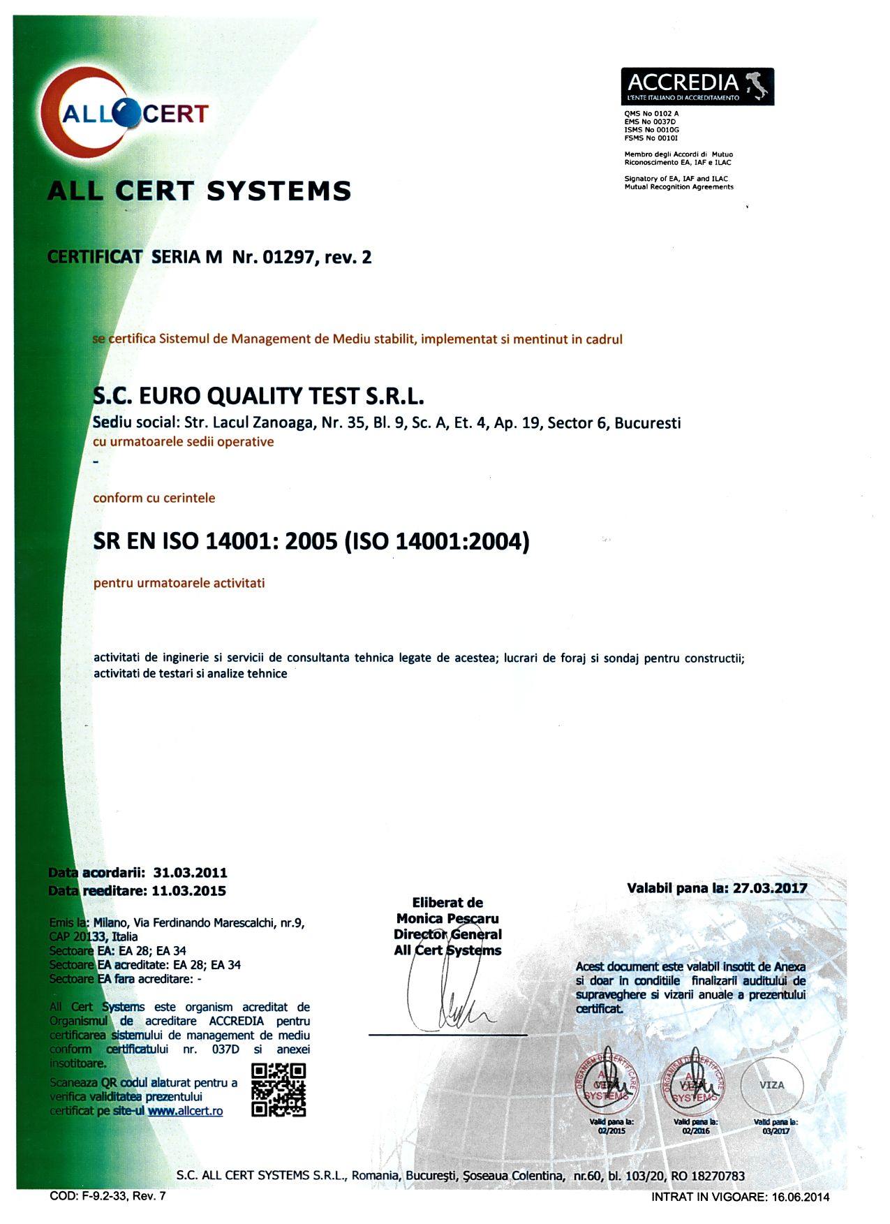 EURO QUALITY TEST a documentat, implementat și certificat un sistem de management integrat conform standardelor SR EN ISO 9000:2008 - Calitate, 14000:2005 - Mediu și OHSAS 18001:2008 – Sănătate și Securitate Ocupațională.