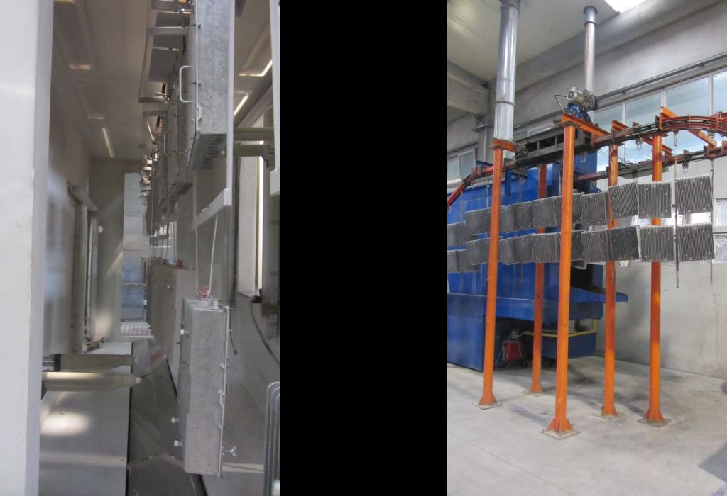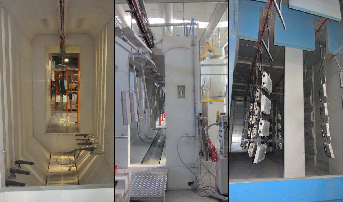 Instalațiile de vopsire cu pulbere sunt formate din bandă transportatoare suspendată, un tunel de tratament, cabine de vopsire cu pulbere și un cuptor de polimerizare cu recircularea aerului cald și cu eliminarea forțată a aerului.
